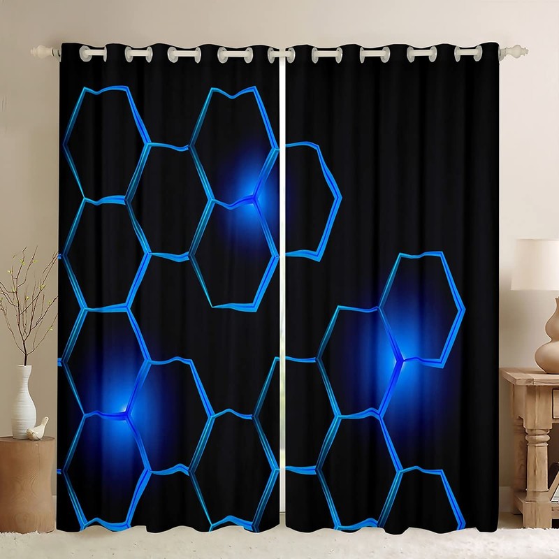 Kids Honeycomb Curtains Modern Hexagon Darkening Dreapes Children Decor Geometrical 30%-50% Blackout Curtains Beehive Geometric Black Blue Window Treatments (2 Panels, 42 x 63 Inch)