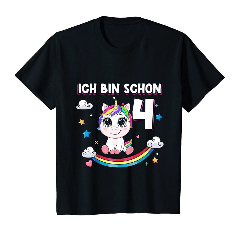 - Give this cute little unicorn with big eyes on our children's T-shirt for your daughter's fourth birthday, or to any 4-year old child who stands on unicorns. Sweet and beautiful. Happy Birthday lovely 4 year old birthday child.