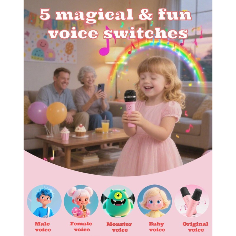 - 【5 Fun Voice Changers + LED Light Show】Switch between Robot, Monster, Baby, Echo & Original voices! 6 colorful LED lights flash to the beat—instant party mode for birthdays, playdates, or family karaoke nights.