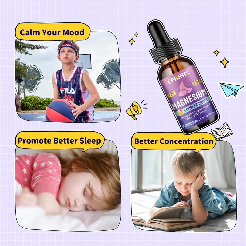 - Calm Magnesium Liquid Drops: Our magnesium for kids liquid drops contain 6 gentle ingredients, including Magnesium Glycinate, L-Theanine, Omega-3, Vitamin B6 & D3, magnesium glycinate liquid for kids help promote restful sleep, calm, energy, relaxation, mood, bones & muscles support for your little one, providing a physical foundation for their happiness and activity