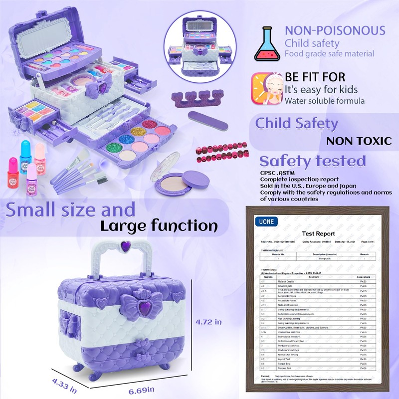 - GIRLS TOYS FUN PRETEND PLAYING:All little princess are eager to have their own makeup set,this complete set can meet all they need to makeup like their mom,also keep your little ones away destroying your expensive make up products.Loving beauty is the nature of everyone, and children are no exception.Our washable Girls makeup toys can satisfy children's curiosity and beauty,it can cultivate and improve children's creativity, imagination and learning ability while enjoying the fun.