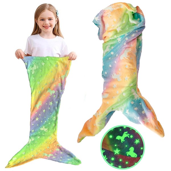 Kids Mermaid Tail Blanket Mermaid Tail Blankets Glow in The Dark Gifts for Girls with Rainbow Ombre Glittering Fish Scale Design(Rainbow Color)