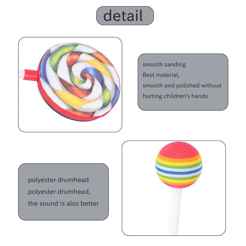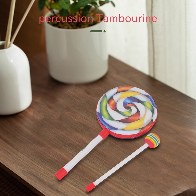 • The Kids Percussion Lollipop Drum is an easy to play frame drum shaped like a lollipop and features a pre-tuned graphic drumhead with a warm, resonant sound.