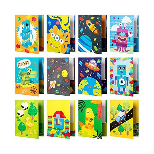Kids Pocket Folders - 12 Homework Folders in Futuristic Robots, Spaceships and Blocks Themes - Kids Folders with Pockets -12 Unique Designs in Front and Back Cover- 2 x 9.25 inch (12 Pack)