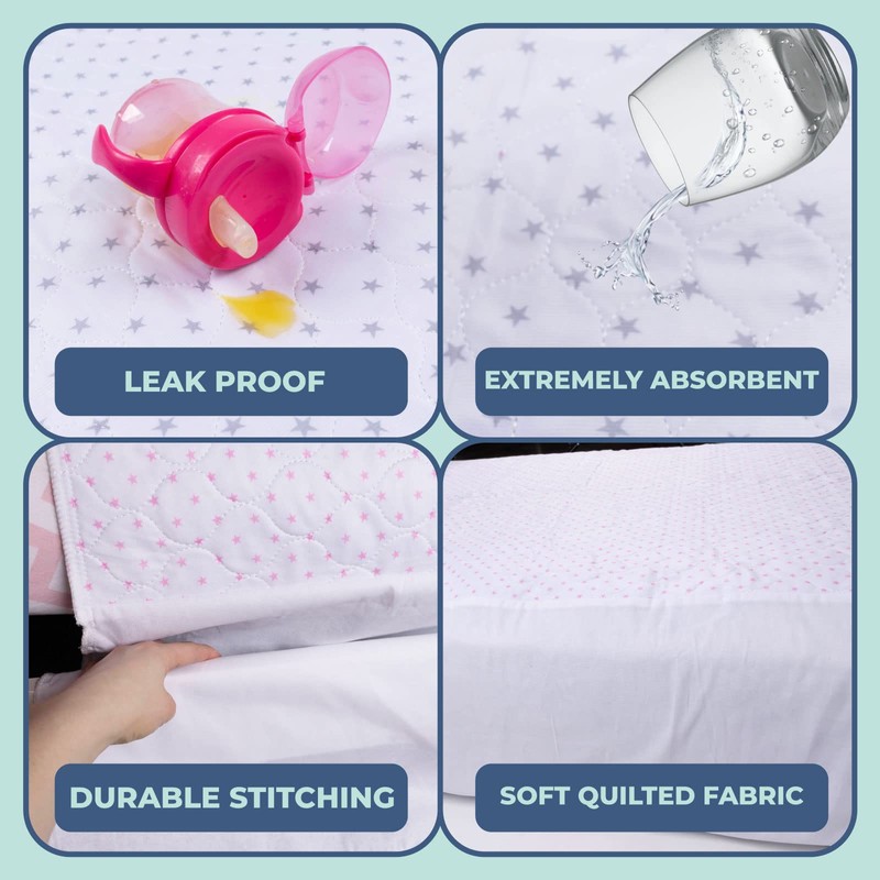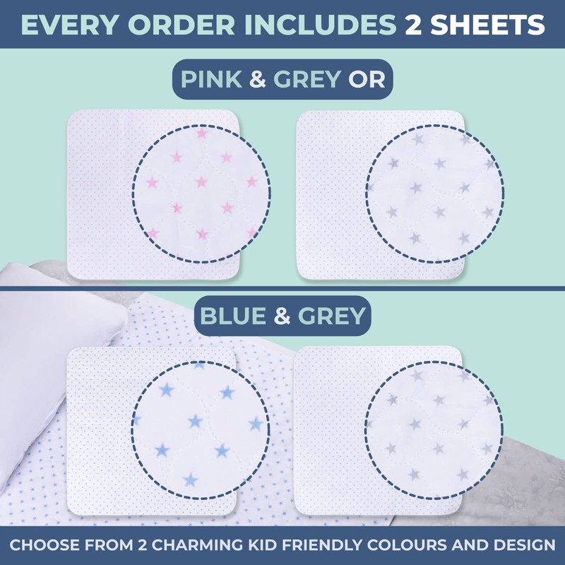 - MADE TO FIT MOST TODDLER BEDS: Each soft, quilted reusable pee pad for kids measures 35 x 33 inches with 17-inch wings to tuck it in, and will comfortably fit most twin/single, toddler, and cot beds. Choose from our Pink/Gray Stars 2-pack or the Blue/Gray Stars 2-pack.