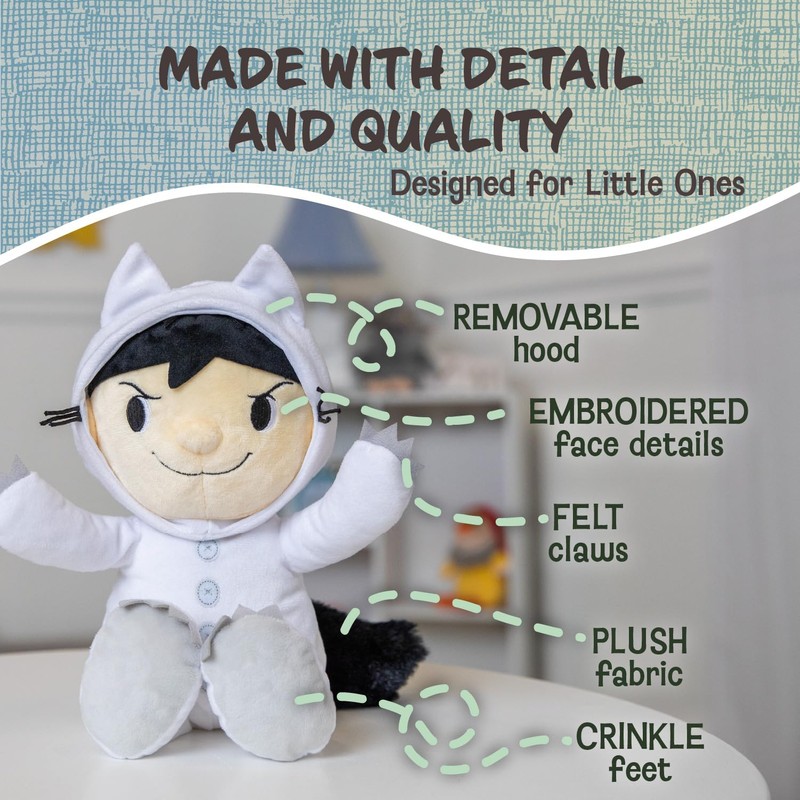 - DETAILS: Inspired by "Where The Wild Things Are," Max stands 14 inches tall, featuring crinkle feet and a removable hood. This plush toy captures the essence of the classic tale and is perfect for fans of the book.