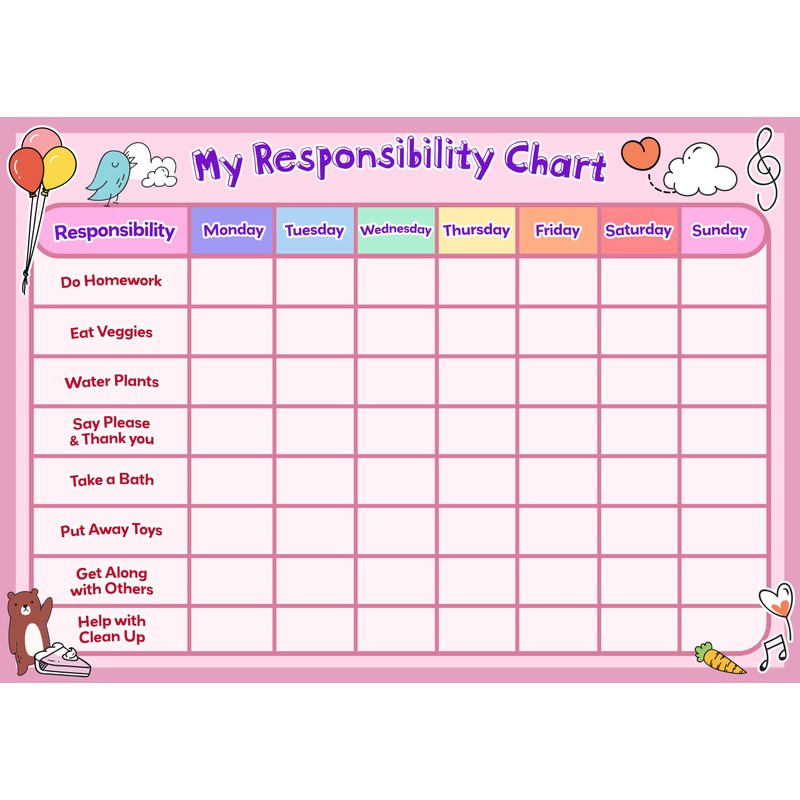 Kids Reward Star Chart Poster Prints (Pink, A4 (21 x 30cm), Responsibility Star Chart)