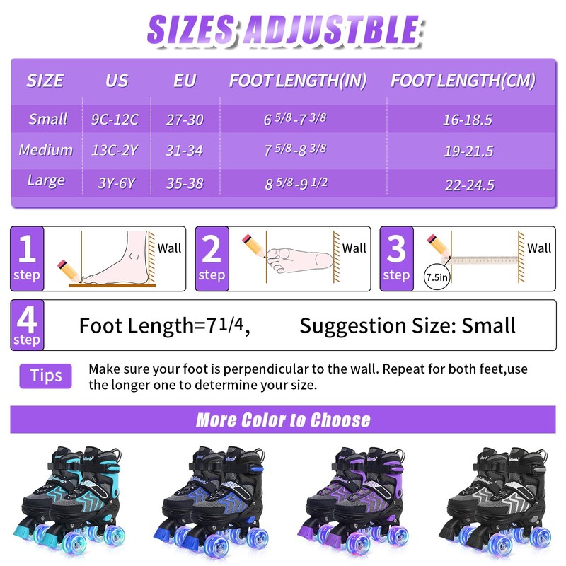 We have different sizes for you to choose,which can be adjusted according to your needs.First choose your size roller skate, then press and hold the adjustable button then stretch your toes to choose the most suitable size.