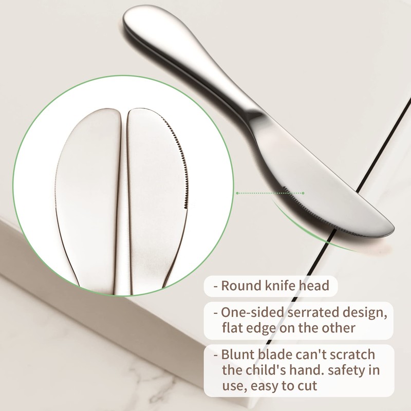 - 🍴🧒【CHILD AND TODDLER SAFE FLATWARE】These kids utensils are designed with exquisite mirror polishing, Handle with smooth edges, fork with squared tines, butter knife with blunt blade, all these details are focused in order to protect the children's fingers and mouth from cuts. Ensure children’s safety is always a top priority for us. Perfect small gifts for little girls and little boys(3 + YEARS OLD)