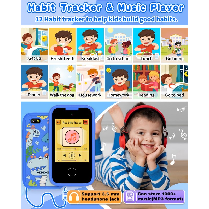 - 【Dual Camera & Habits Tracker】Dual-camera, easy to take selfies and catch the wonderful joy moment. With 23 cute stickers, kids can take more humorous photos with family and friends. Kids can customize their own style by choosing from 31 wallpapers and 10 desktops. The kids cell phone also have some useful features, such as alarm and flashlight, which contribute to kids adaptability. Kids phone toy comes with a habits tracker that helps kids to build healthy habits with 12 alarm modes