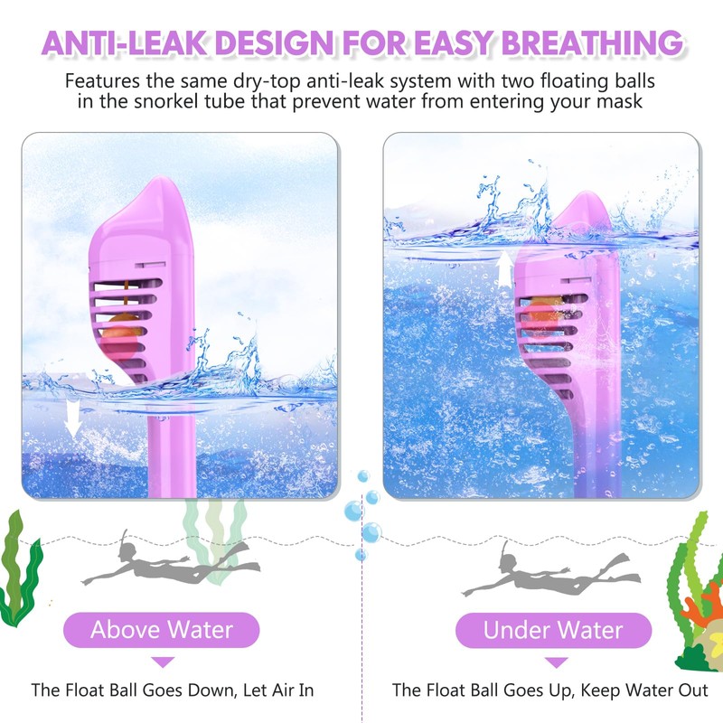 • 👧👦【ANTI-FOG & ANTI-LEAK】The snorkeling gear for kids, Separate inhaling and exhaling channels can effectively prevent the reinhalation of exhaled CO2, thus ensuring your kids breathe fresh air every time. Newest floating ball design stops water from entering in mask and let air in, which gives your children amazing diving experience.
