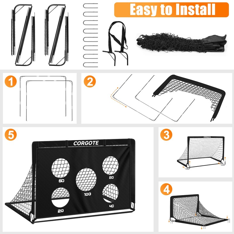 - Detachable Soccer Goal Target: Our backyard soccer goal net with a target sheet offers versatility for training drills. The goal features five target areas, allowing kids to practice shooting accuracy, improve ball control, build muscle memory, strengthen defensive skills, and spark their interest in soccer. This soccer goal is perfect training equipment for kids ages 3-14