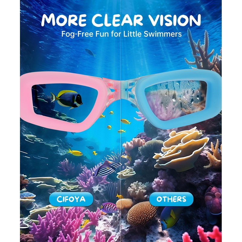 - Leak Free and Waterproof: CIFOYA kids swimming goggles are equipped with soft silicone seals that protect children from raccoon eyes, chlorine and bacterial, also not letting the water in. The swimming goggles for kids are ergonomically designed to ensure that they are suitable for different facial shapes. The soft silicone material not only relieve the pressure on the skin and enhances the comfort level but also contributes to the durability of the kids goggles