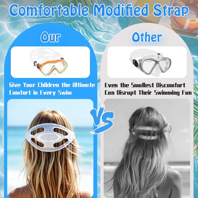 - Crystal Clear Anti-Fog & 180° Panoramic Vision:A special anti-fog coating keeps the lenses clear, even during prolonged underwater use. The dual-lens design provides a stunning 180° panoramic view, allowing children to fully immerse themselves in the underwater world—perfect for both pool and beach adventures.