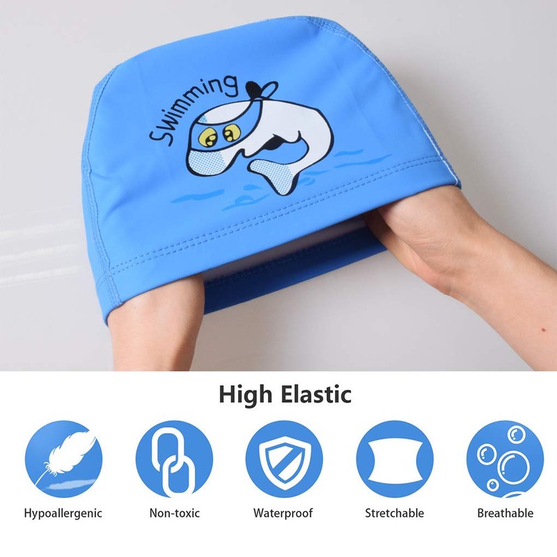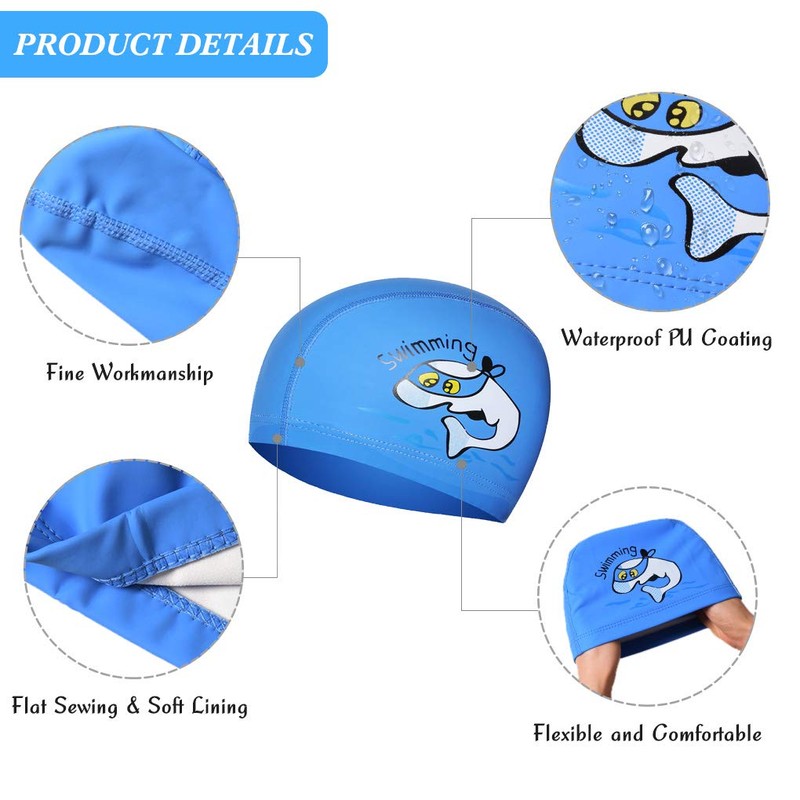 Kids Swimming Cap,Paciffico Swimming Hats Waterproof PU Bathing Cap Care Ear Protection Elastic Swimming Cap with Coating Cartoon Pattern for Childen Kids Boys Girls Age 3-12 Blue