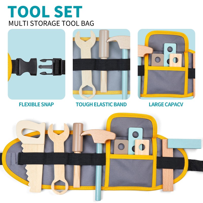 - đź› WOODEN TOY WORKBENCH FOR KIDS - This kids workbench including tool bench, tool belt,Toy Drill,hammer, wrench, screwdriver, square, saw, screws, nuts, links and more creative parts for building,let your toddler explore their creativity with this kids workbench.