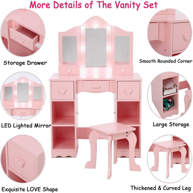 - 【Durable & Kid-Friendly Design】: The vanity set is constructed with solid MDF material, ensuring stability and sturdiness for long-lasting use. It is painted with kid-friendly paint and features rounded corners, providing all-round protection for children and allowing them to play without worry about.providing a safe and secure environment for kids to enjoy their playtime.