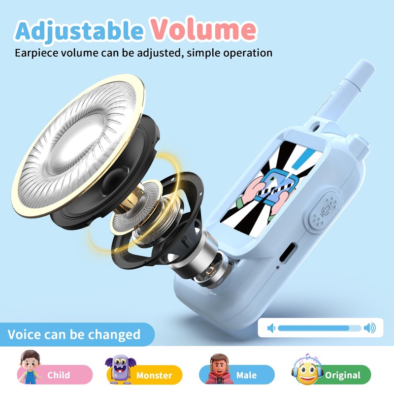 - 【Increase Playability】The video walkie talkies has 3 video switching modes and 4 voice switching (children/monsters/male voices/original voices) to increase the playability of the intercom. Children can use the intercom for outdoor adventures, outings, and camping by pressing the function key to enhance the fun of parent-child interaction.