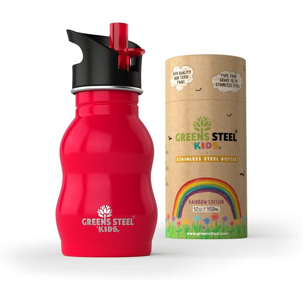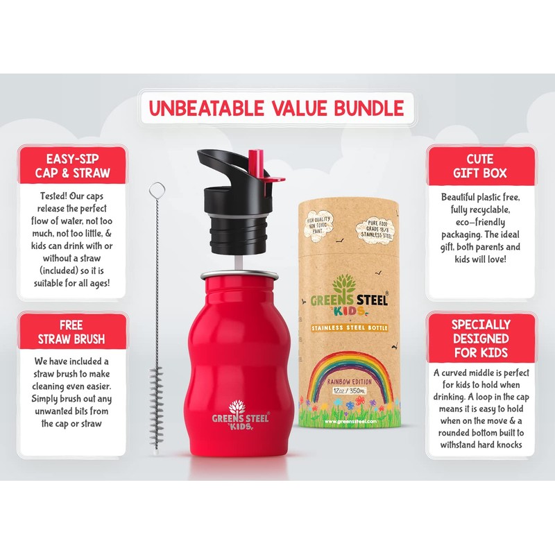 Kids Water Bottle - 350ml, Red | Stainless Steel | Upgraded Leak Proof Lid With Straw & Handle for Children | Easy Sip Toddler Cup | Eco Friendly Drinks Bottle | Great for a Lunch box or Gift