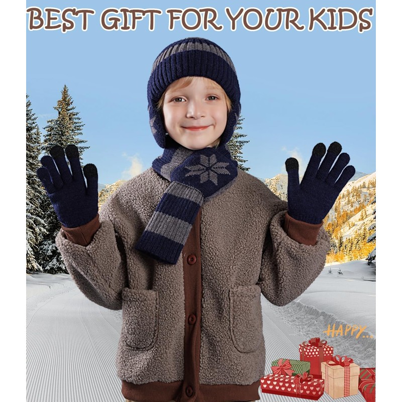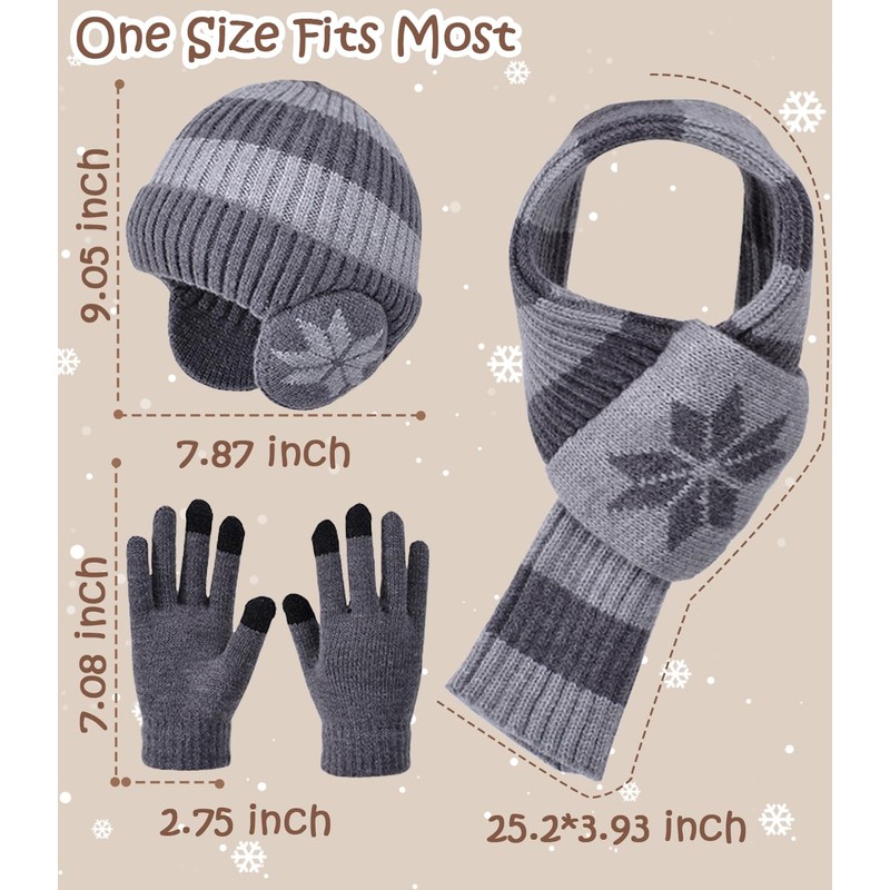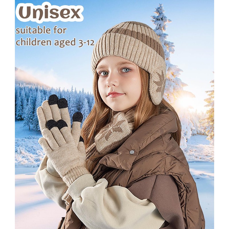 Kids Winter Hat Scarf Gloves Set 3Pcs, 3-12Y Fleece Lined Beanie With Earmuffs Double Layer Scarf Touchscreen Gloves Toddlers (Grey)