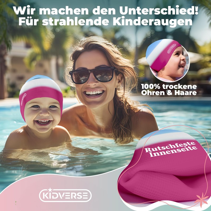 - Skin-friendly: Our swimming cap for children is made of skin-friendly and hair-friendly silicone. In addition, the waterproof swimming cap protects children from harmful UV rays and contributes to long-lasting fun in and in the water.