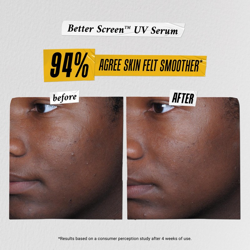 - Better Screen uv serum SPF 50+ facial sunscreen with collagen peptide helps protect against uv damage, correct visible signs of aging like tone & texture, clinically demonstrated spf 50+ helps boost skin's radiance.