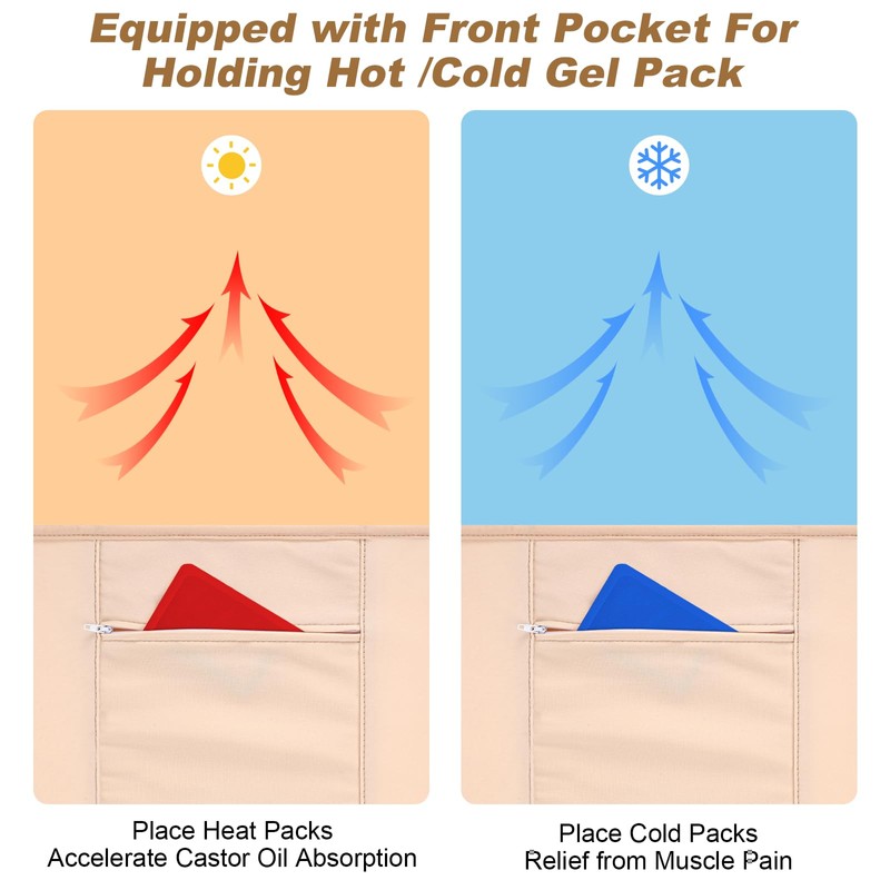 - Extra Front Pouch Design: Our castor oil wrap features an innovative front pouch, allowing you to insert a heating pad or ice pack (not included) to enhance the effects of the castor oil compress. This design is ideal for targeting stomach discomfort, muscle, and joint pain, making it a versatile addition to your wellness routine.