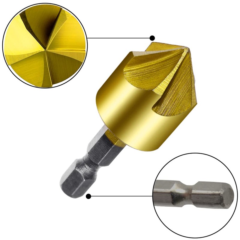 - Chamfer Cutter + Automatic Center Punch Size: 6mm, 8mm, 9mm, 12mm, 16mm, 19mm Countersunk angle 90°, hexagonal shaft 6.35mm, automatic center punch length 128.6mm
