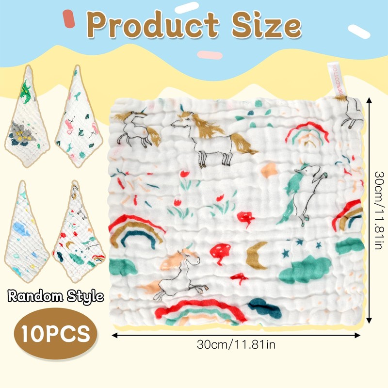 - 【Muslin Cloths for Baby Set】:You will receive 10 pieces of Muslin Cloths Baby Face Towel, size 30 x 30cm.The large number of Muslin Squares Baby Essentials can meet the frequent needs of daily cleaning and care of babies, ensure that babies are always dry and comfortable, and make your parenting life easier and more worry-free.