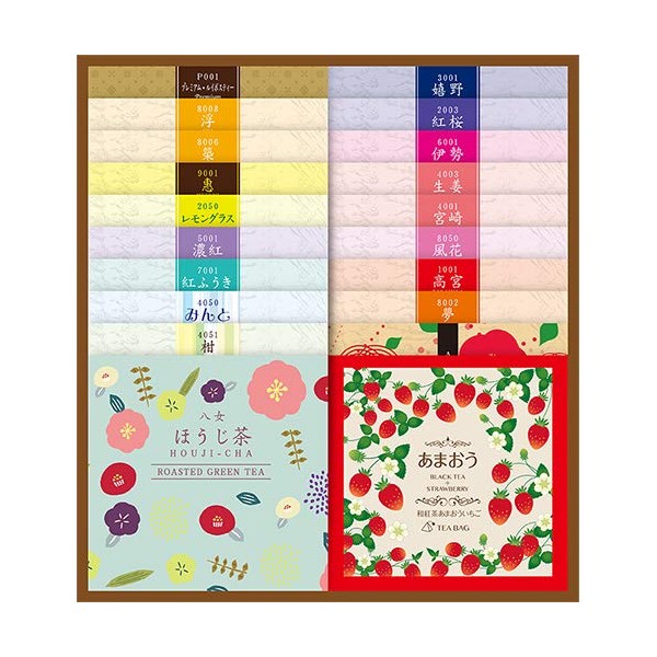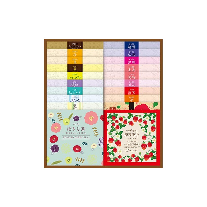 This set includes 11 types of Japanese tea, 5 types of flavored tea, 2 types of non-caffeinated tea, 1 type of green tea, and 1 type of rowhide.