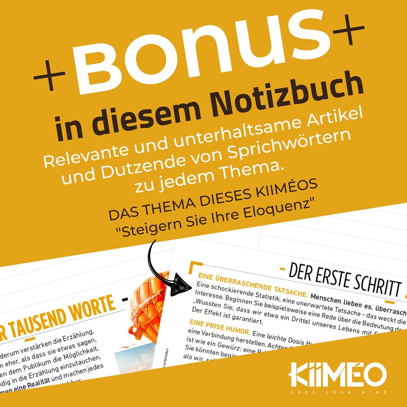 KIIMEO The First Professional and Thematic Notebook - Innovative Premium Journal - Tips & Articles on Eloquence - 140 Pages + 1 Erasable Page - Pen Included