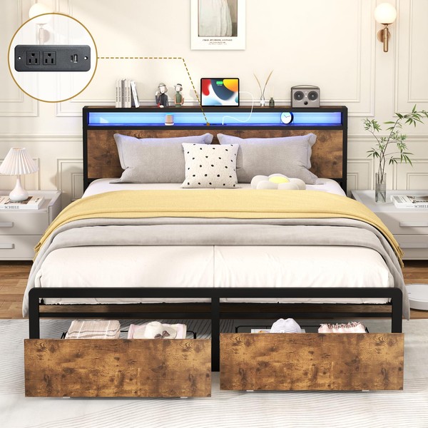 Kiivakii Queen Size Bed Frame, LED Storage Headboard with Charging Station, 2 Drawers Platform Bed Frames, Stable and Solid, No Box Spring Needed, Rustic Brown