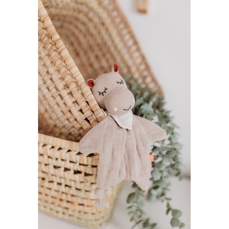 The cuddly blanket in hippo design is a soft and cuddly cloth for your baby. It has two small knots that invite babies to grab and explore. It is ideal for cuddling while promoting the child's tactile development.