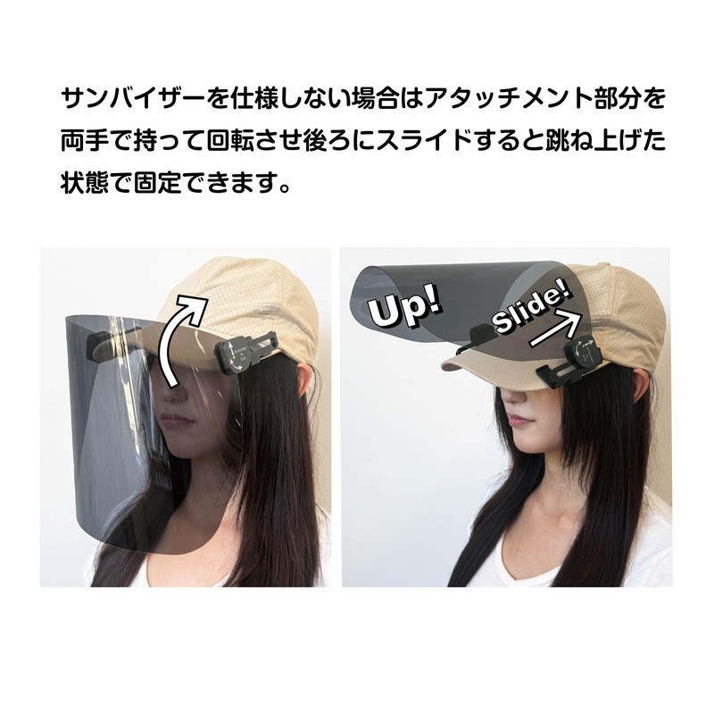 - Attach the visor to the left and right side of the hat brim. When not in use, the attachment part can be slide back and lifted