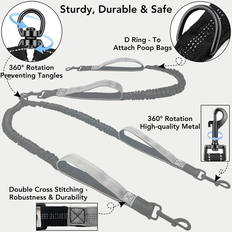 - 【Tangle-Free & Reflective Strips & D-Ring Design】The 360° swivel buckle allows automatic adjustment when dogs crisscross, perfectly preventing tangles. Our double dog leash features 3M reflective stitching for added safety and visibility at night, ensuring enjoyable walks or runs. The D-ring can be used to attach additional accessories such as a portable water bottle or waste bag dispenser, making it convenient to carry essentials and enhancing the practicality and convenience of your dog walks.