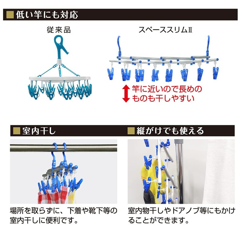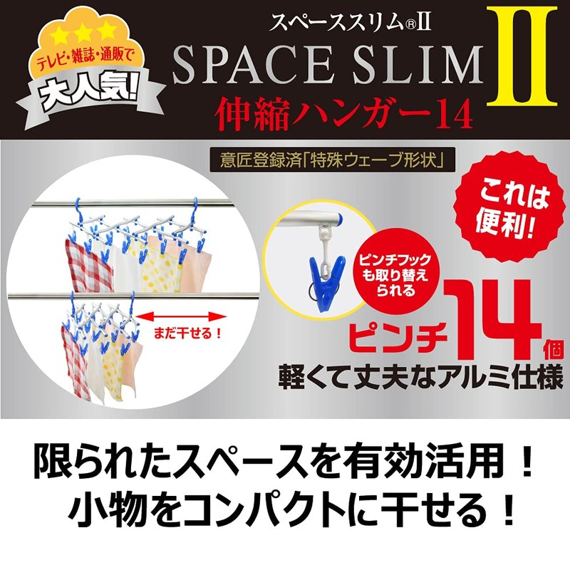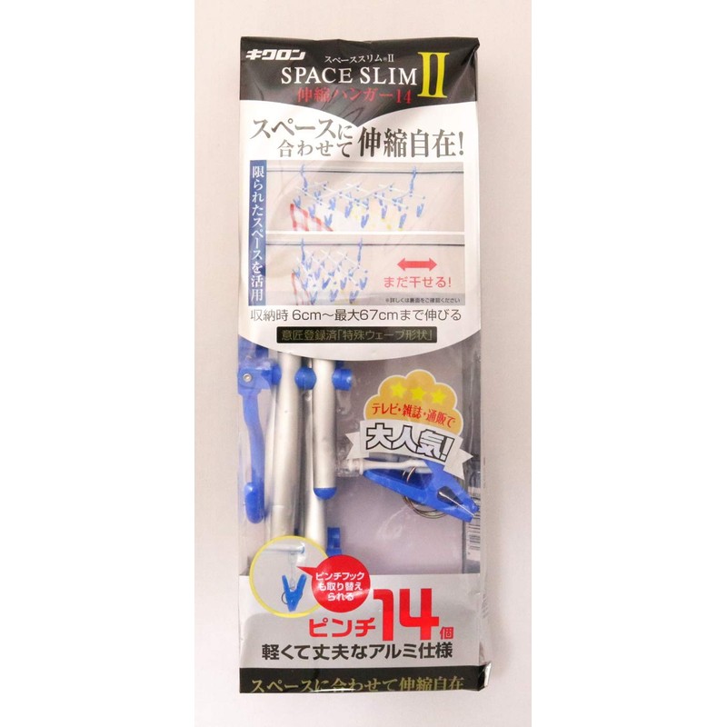Kikuron Laundry Clothes Drying Hanger, Elastic Hanger, 14 Pinch, Blue, Interchangeable Pinch, Corner Hanger, Space Slim II