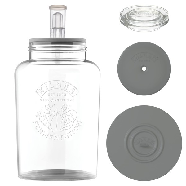 - CONTENTS | This set includes one Kilner 5 Litre Fermenting Jar, one glass weight, one air lock, one silicone lid, one silicone sheet and one recipe/ instruction booklet. The silicone lid with air lock, allows gas to be released but does not allow air to enter the jar during the fermentation process. The clever design of the silicone sheet and glass weight, ensures that the contents are submerged under the brine to prevent any spoilage.