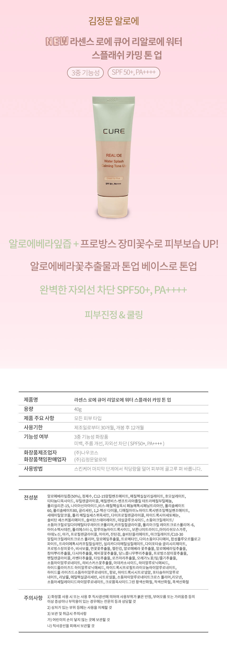 김정문알로에라센스로에큐어리아로에워터스폴래쉬카밍톤업40g(SPF50+)1개SF