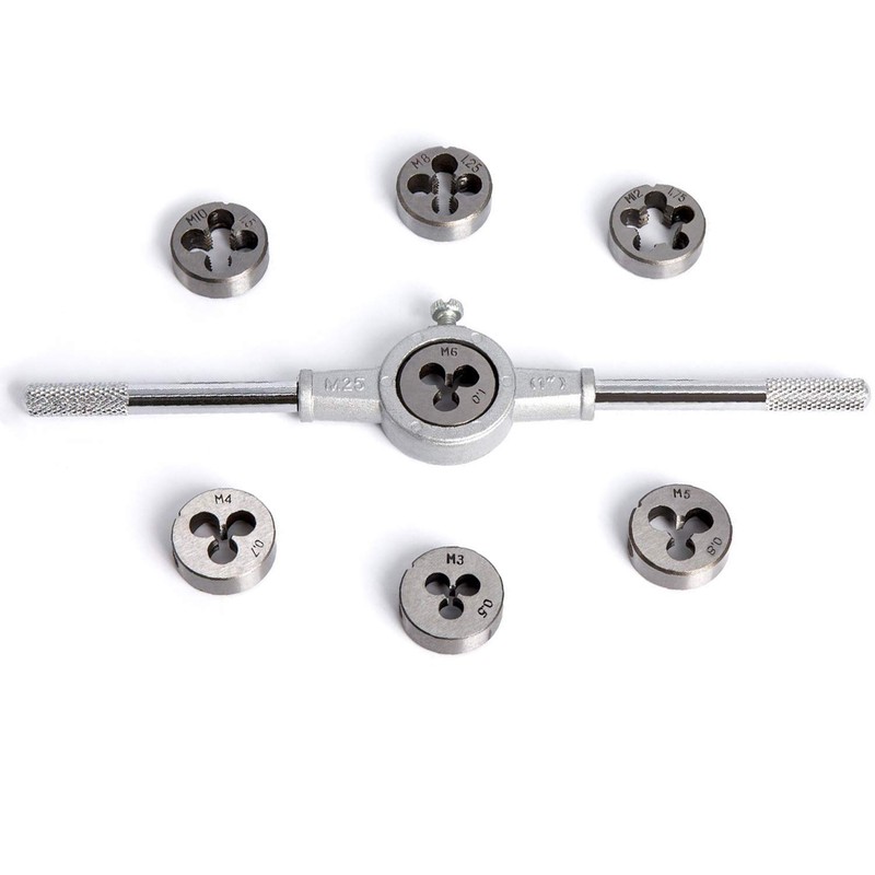 - Package included: 1 x Dice Handle, 7 x Round Dice (M3X0.5, M4X0.7, M5X0.8, M6X1.0, M8X1.25, M10X1.5, M12X1.75)