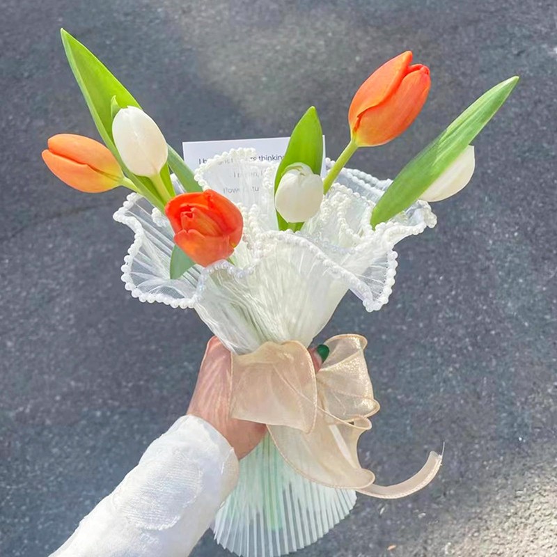 - Pearls Edge: The white flower wrapping mesh paper are designed with lustrous and neatly arranged pearl bead around the edges.The pearl edge match the elastic pleats of the wrapping paper,which make your bouquet more beautiful and upscale.
