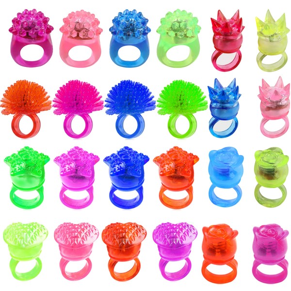 - Value Package: The glow in the dark party favors small toys set contains 24 pcs flashing LED bumpy rings.These glow in the dark party supplies have 6 different styles(random color assignment) and will light up night.Perfect for kids/adults party supplies decoration and party games.