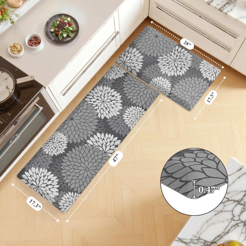 - Comfort Anti-fatigue Kitchen Mats: 0.47inch (12mm) thick anti fatigue kitchen floor mat cushions feet knees lower back and joints during prolonged standing. Experience firm yet soft cloud-like comfort while cooking in kitchen or working at standing desk