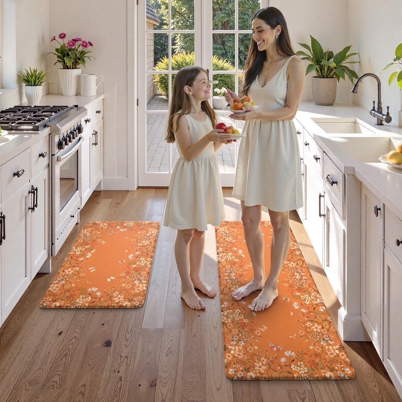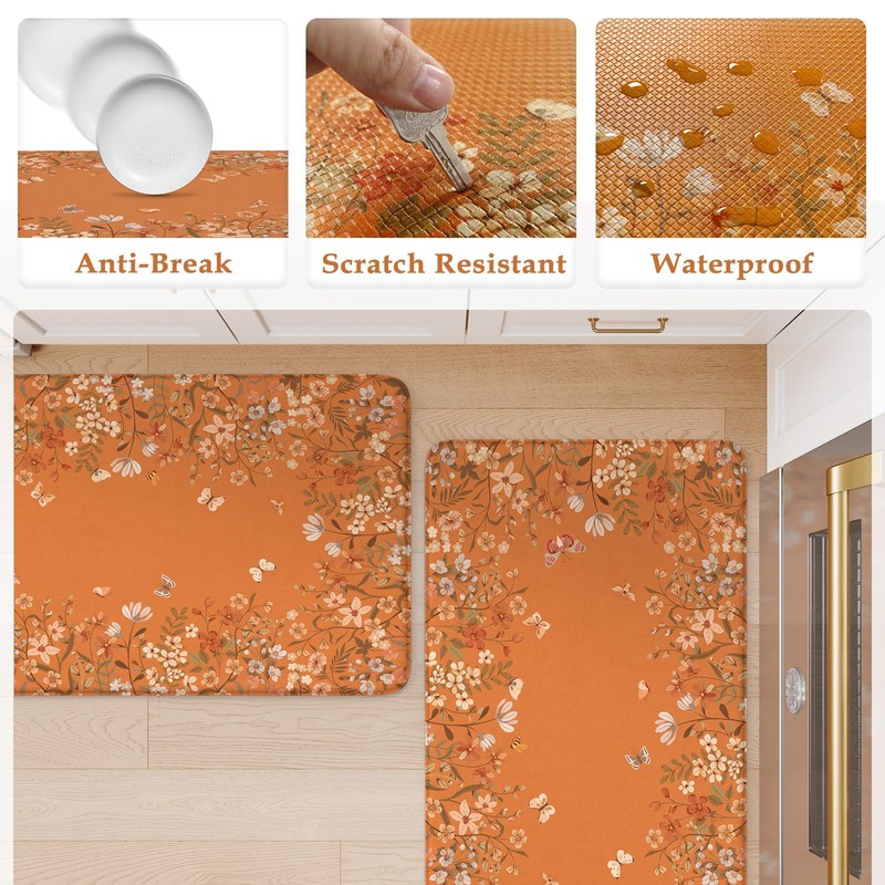 KIMODE Anti Fatigue Kitchen Mats Cushioned, Boho Floral Kitchen Rugs Sets of 2, Non Slip Kitchen Mat for Floor, Memory Foam Standing Desk Mat for Laundry Office Sink Desk Orange 17"x47"+17"x29"
