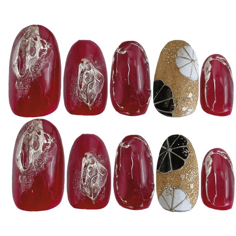 Kimono Red Nail Tip Japanese Style Golden Gold