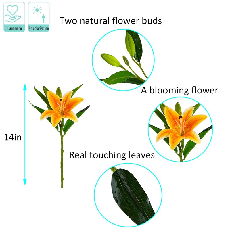 - Realistic Touch & Complete Set:Package includes 6 artificial tiger lily stems (15-inch length each) with lifelike petals and velvety texture. Each stem features 1 blooming flower + 2 natural-looking buds for dimensional elegance