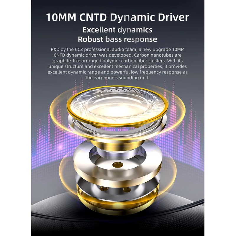 - "10MM CNTD Dynamic Driver CCZ BC04 iem headphone adopts a new upgrade 10MM CNTD dynamic driver was developed. Carbon nanotubes are graphite-like arranged polymer carbon fiber clusters. with its unique structure and excellent mechanical properties, it provides excellent dynamic range and powerful low frequency response as the earphone's sounding unit."