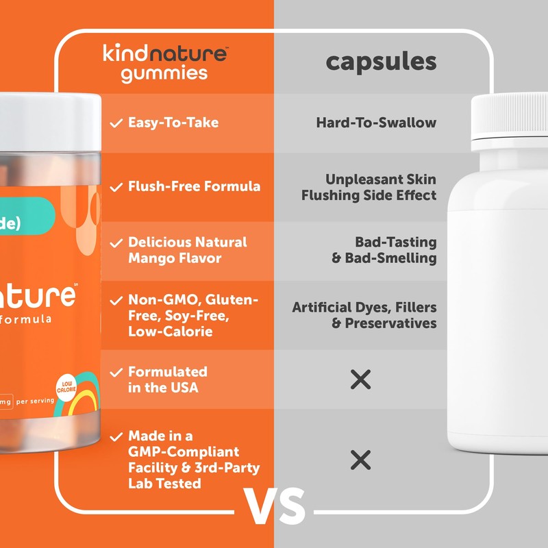 - Flush-Free Formula – Each Kind Nature Niacin supplement gummy delivers 500mg of Vitamin B3 as Niacinamide, providing an effective dose for your wellness without the uncomfortable flush often associated with other forms of Niacin