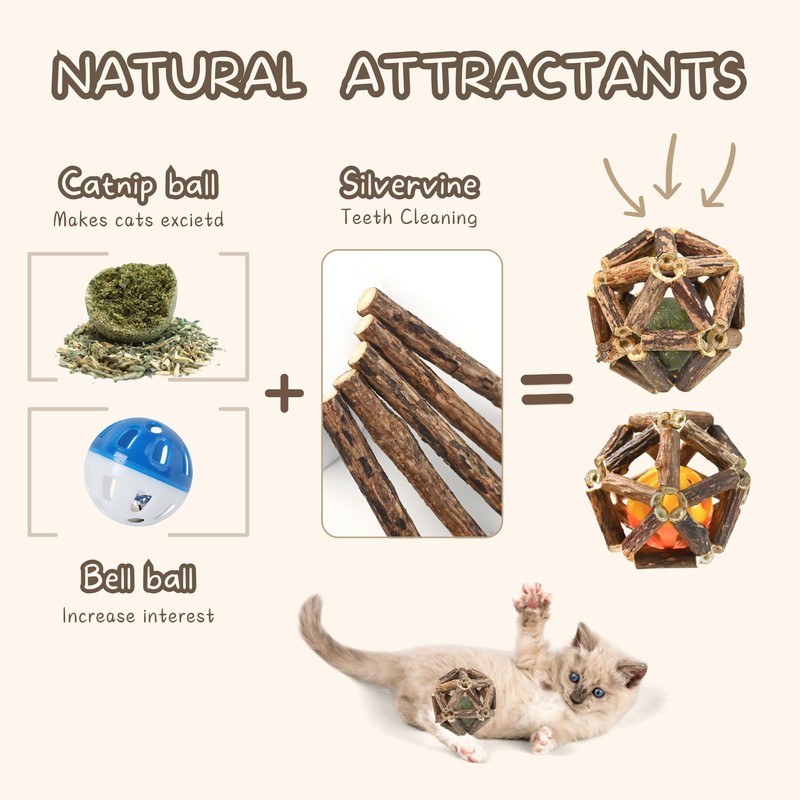 KINDABLU Catnip and Silvervine Ball Toy Set for Cats, Catnip Ball Promotes Dental Health and Relieves Stress, Cat Chew Stick with Natural Materials, Hand-Woven Cage Balls, Silvervine Sticks for Cats
