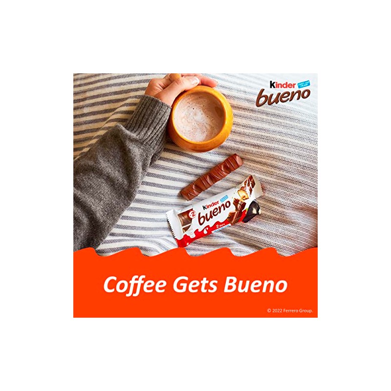 - TREAT YOURSELF: Make an ordinary moment extraordinary by adding the crispy, creamy deliciousness of a Kinder Bueno milk chocolate bar to your coffee moment or movie night. You can also make your desserts and baked goods more delicious by topping them with Kinder Bueno