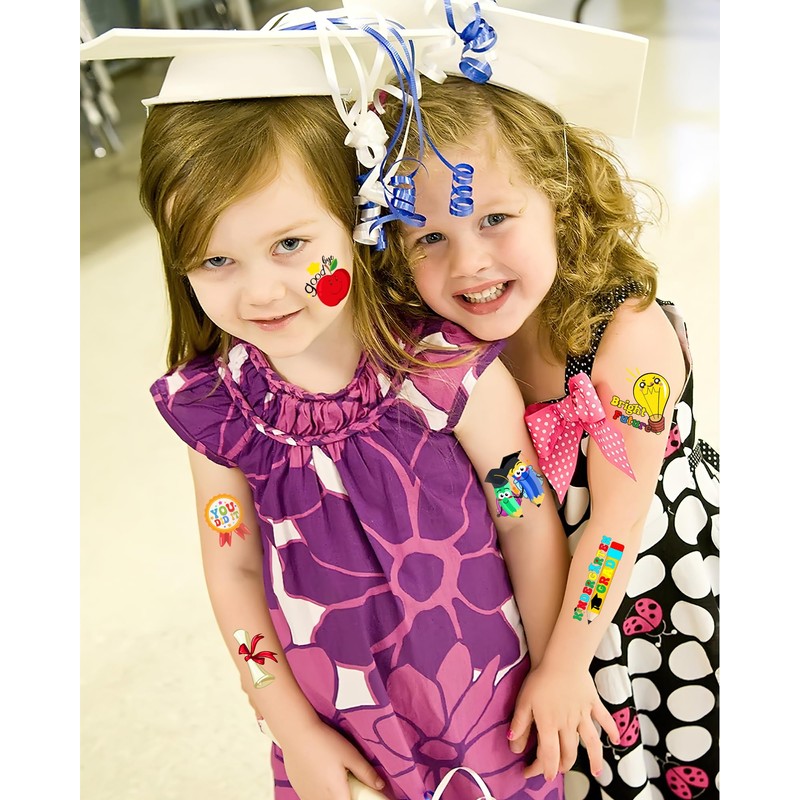 - Easy to Use Kindergarten Graduation temporary tattoos, Cut out the desired motif,remove the plastic covering film of Graduation temporary tattoo,then stick the tattoo face down on the clean and tidy skin,wet the tattoo with water,gently pat and press for about 30 seconds,then tear off the paper
